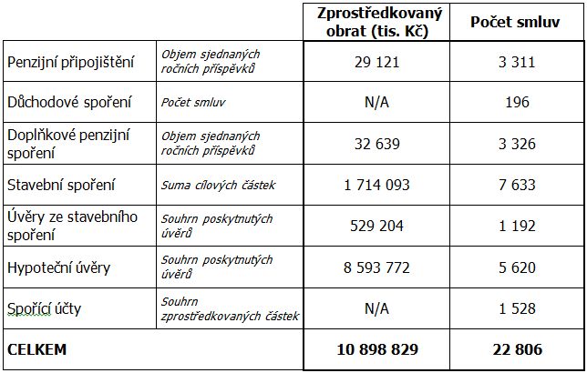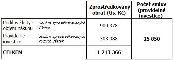 U investičních produktů sledují obě sdružení podrobnou strukturu peněžních toků, které umožňují identifikovat poměr jednotlivých nástrojů. Celkem byly v této oblasti zprostředkovány produkty za 1 213 366 tis. Kč na základě 25 850 smluv.