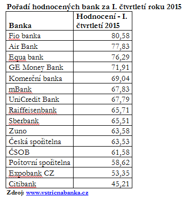 GEEN Nejvstřícnější bankou za první čtvrtletí roku 2015 se stala opět Fio banka. Banka tak navazuje na své úspěchy z předchozích ročníků hodnocení. Druhá v pořadí se umístila Air Bank a na třetím místě pak Equa Bank.