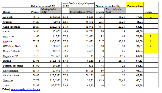Na prvních třech nejlepších pozicích se umístily tentokrát hned tři nízkonákladové banky. Z větších bank se nejlépe dařilo GE Money Bank, která obsadila čtvrté místo a hodnocení 71,91 procent.