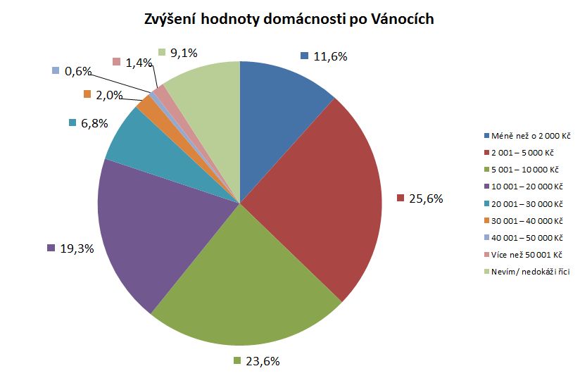 Průzkum České pojišťovny rovněž ukázal, že u 12 procent respondentů vzrostla hodnota jejich domácnosti o necelé 2 tisíce korun. Čtvrtina domácností si přes Vánoce nadělila dary v hodnotě 2 až 5 tisíc korun. Další téměř čtvrtina dotázaných zhodnotila díky vánočním dárkům svou domácnost o 5 až 10 tisíc korun a pětina dotázaných dokonce o 10 až 20 tisíc korun.