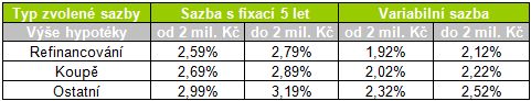 Zájemci o Fio hypotéku do 70 % hodnoty nemovitosti mohou nyní dopředu počítat pro daný typ fixace s jednou ze dvou sazeb rozlišených dle celkové výše úvěru. U refinancování tak při pětileté fixaci získají buďto sazbu 2,59 % p.a. (u hypotéky od 2 mil. Kč výše), nebo 2,79 % p.a. (do 2 mil. Kč), u variabilní sazby dokonce aktuálně (při současné výši PRIBOR) 1,92 % p.a. / 2,12 % p.a. Podobně to bude u koupě a ostatních účelů, viz přehledná tabulka níže. Stejný postup výpočtu sazby platí i pro další délky fixací.