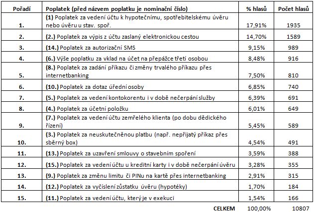 Na prvním místě průběžného pořadí se prozatím drží – v minulém roce velmi hojně mediálně diskutovaný – „poplatek za vedení účtu k hypotečnímu, spotřebitelskému úvěru nebo úvěru u stavebního spoření“, který prozatím obdržel 17,91 % hlasů. Stříbrná pozice patří „poplatku za výpis z účtu zaslaný elektronickou cestou“ (14,70 % hlasů), bronz drží „poplatek za autorizační SMS“ (9,15 % hlasů).