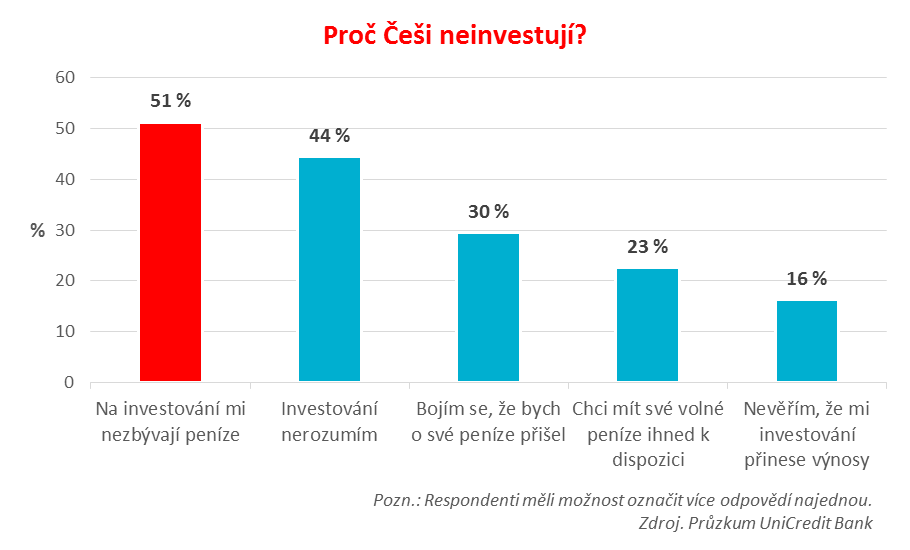 Každý druhý dospělý Čech neinvestuje a své peníze nezhodnocuje. Myslíme si totiž, že na investice nemáme dostatek peněz. Průzkum UniCredit Bank o investování Čechů přitom ukazuje opak. Díky posilující ekonomice a rostoucím platům až 85 % Čechů dokáže měsíčně z rodinného rozpočtu odložit alespoň 500 korun z volných peněz na investice. To je právě minimální hranice pro pravidelné investování, například s programem U Invest právě od UniCredit Bank. Téměř polovina Čechů (45 %) tvrdí, že investování nerozumí. Ke vstupu do světa investic by jim proto pomohla profesionální pomoc a rada odborníka.