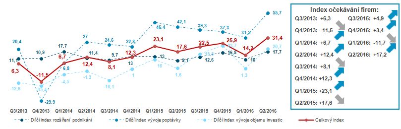 Rekordy lámou i investice – podíl podnikatelů, kteří předpokládají, že objem investic bude v tomto roce větší než loni, vzrostl o 10 %. Je tak největší za celou dobu sledování Indexu. Dodatečné šetření v rámci Indexu očekávání firem, které proběhlo po referendu ve Velké Británii, ukázalo, že se lehce zchladil investiční apetit českých podnikatelů. Aktuální hodnota dílčího indexu objemu investic je ovšem s hodnotou 20,7 bodu historicky druhá nejvyšší. „Vzhledem k poklesu v předešlém kvartálu se zdá, že předpoklad nárůstu investic je pobídnutý momentálním ekonomicko-politickým děním. Tuto hypotézu podporuje urychlení mezikvartálního růstu HDP, k němuž dochází,“ komentuje očekávání podnikatelů Martin Kupka, hlavní ekonom ČSOB.
