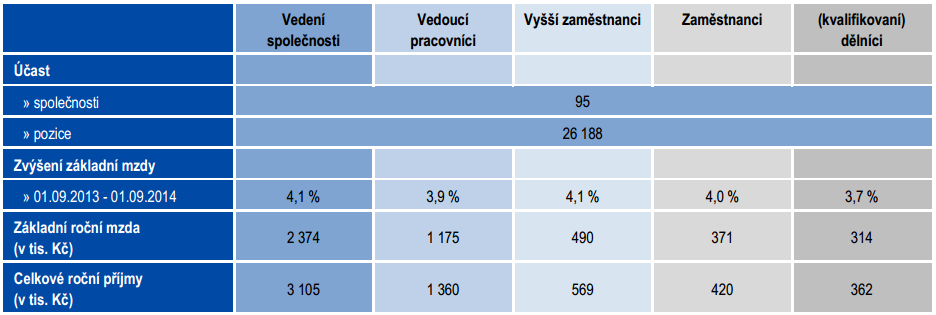 Mzdy v českém hospodářství se zvýší v roce 2015 v průměru o 2,5 procenta. To je méně než v předešlých dvou letech, ve kterých mzdy rostly průměrně o 4 procenta. V současné době činí průměrná základní roční mzda vedení společností v České republice zhruba 2,4 mil. korun.